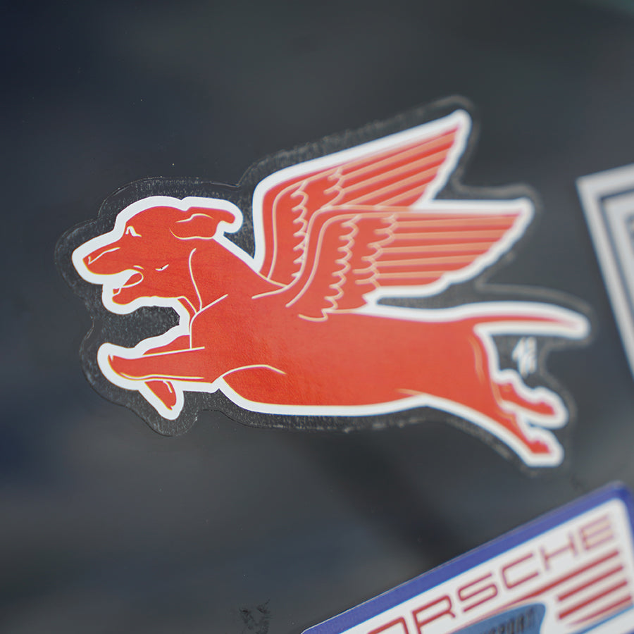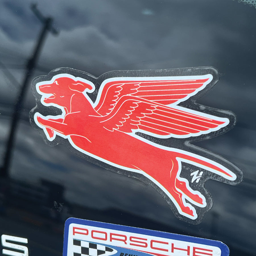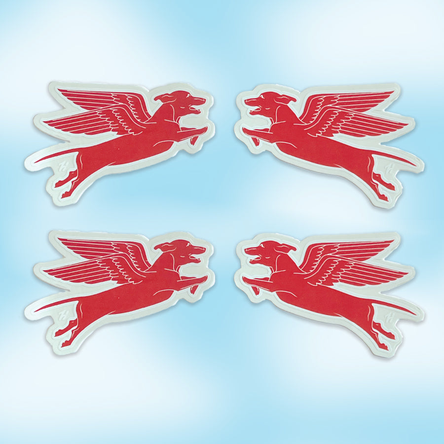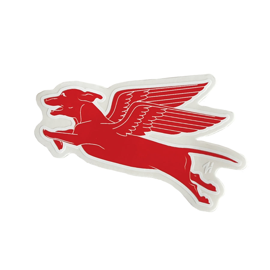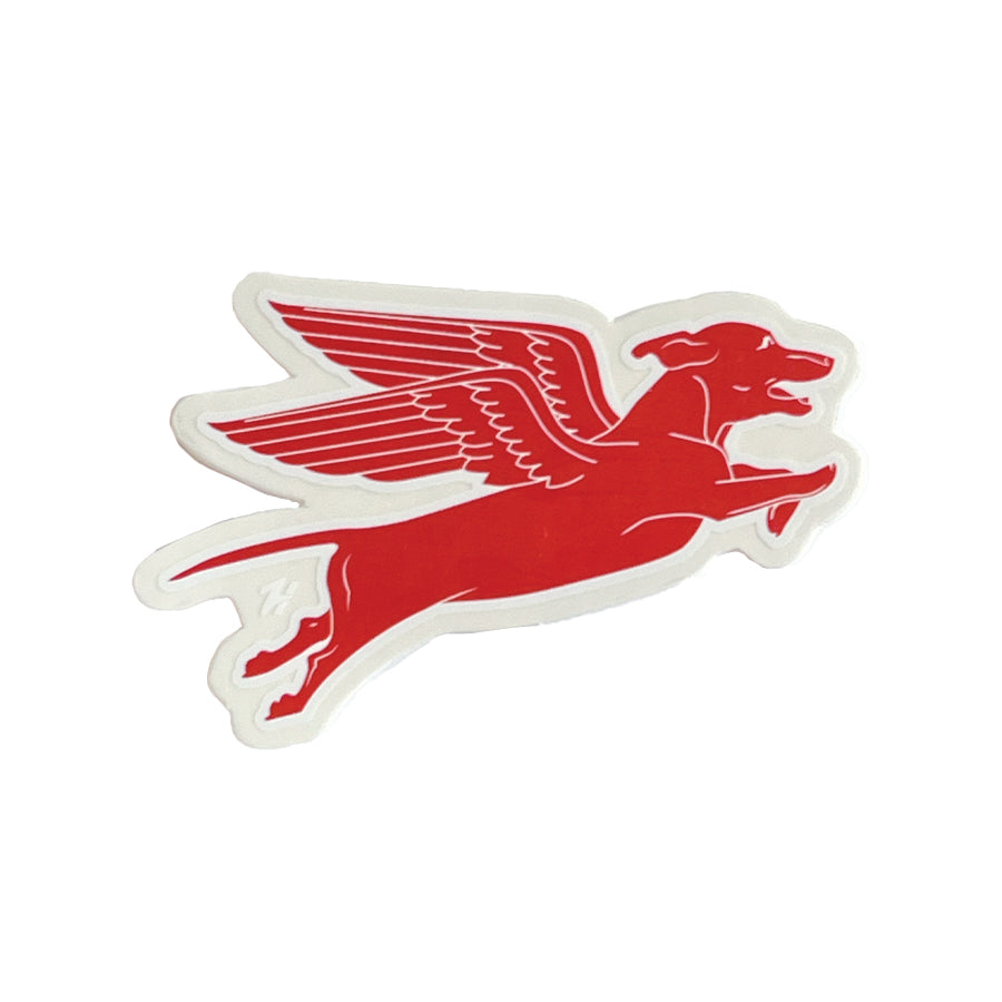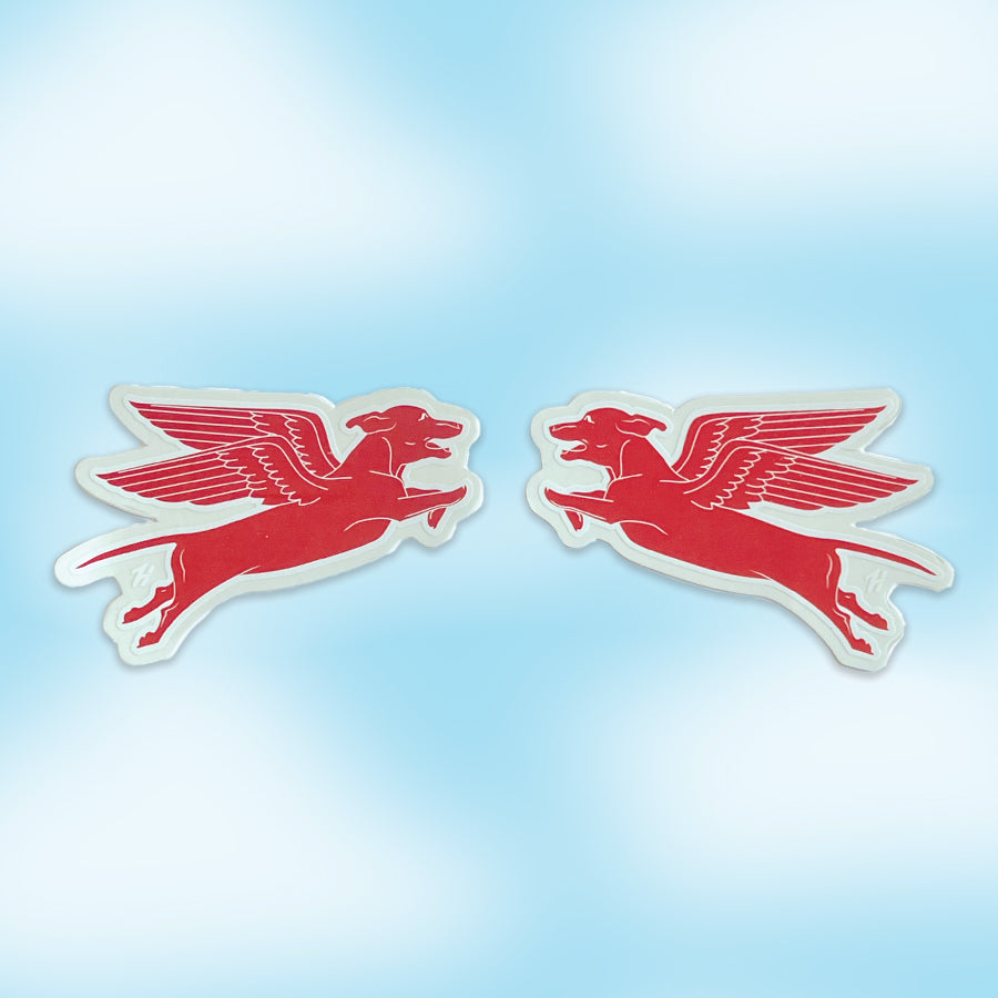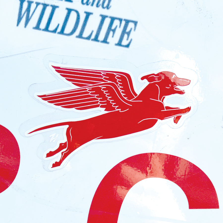 Sticker up your German car with a German dog or two. Flying Dachshund stickers available in left and right facing. White and red printed on outdoor rated clear vinyl. Buy individuals or a set of two. Save when you buy a 4 pack.